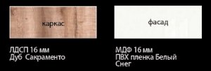 - Коллекция представлена в следующем цветовом решении: Корпус ЛДСП 16 мм в декоре «Дуб Сакраменто» и фасад МДФ 16 мм в декоре «Белый снег глянец»
