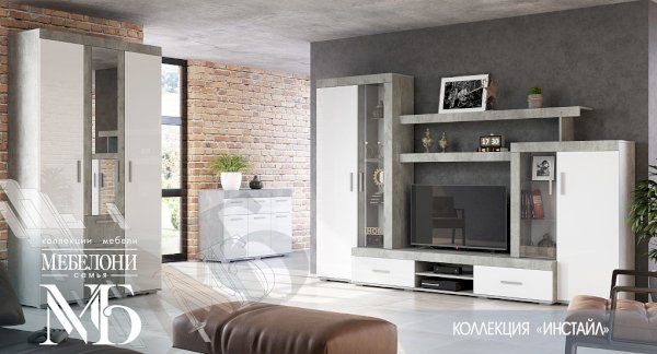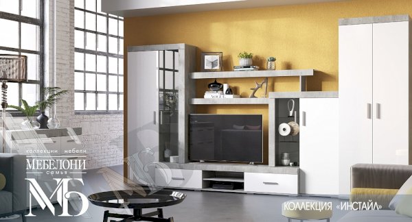 Гостиная Инстайл по достоинству раскрывает ненавязчивую утонченность и деликатность бетонных мотивов в интерьере, а сочетание с белыми глянцевым декором на фасадах придает интерьеру утонченной строгости. Гармонично сочетая в себе лаконичные формы скандинавского дизайна и брутальные черты индустриальной эстетики гостиная предельно точно передает дух современных мебельных трендов.