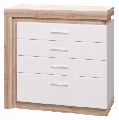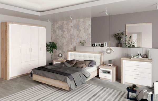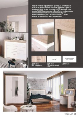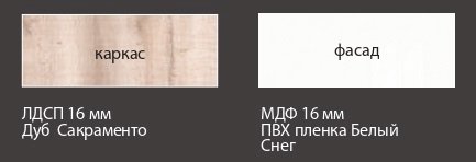 - Коллекция представлена в следующем цветовом решении: Корпус ЛДСП 16 мм в декоре «Дуб Сакраменто» и фасад МДФ 16 мм в декоре «Белый снег глянец»