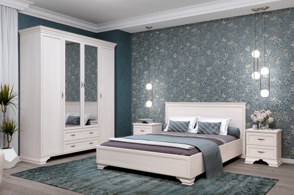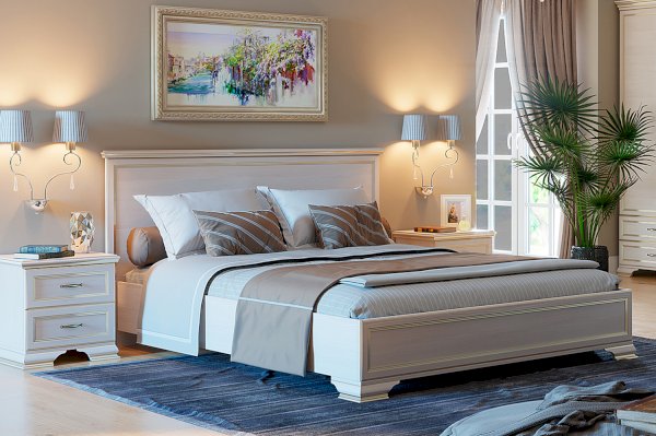 Правильные формы и изящный декор в виде профилей и опор, украшенных золотой патиной создают образ двуспальной кровати в классическом стиле.