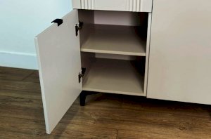 Дизайн комода продуман до мелочей: с одной стороны расположена глухая дверца, за которой скрывается просторное пространство для хранения. С другой стороны – ниша с открытой полкой, выкатной ящик и ещё одна глухая дверца, что позволяет гибко организовать хранение и поддерживать порядок в доме.